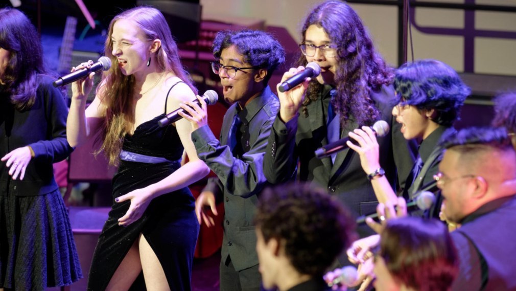 Thirteen students from LPC’s vocal jazz ensemble “BayBop” and one professor, Andreas Preponis, performed side by side. Each performer carries their own part through elements of “scatting,” a vocal improvisation technique of nonsense syllables, building a layered sound.