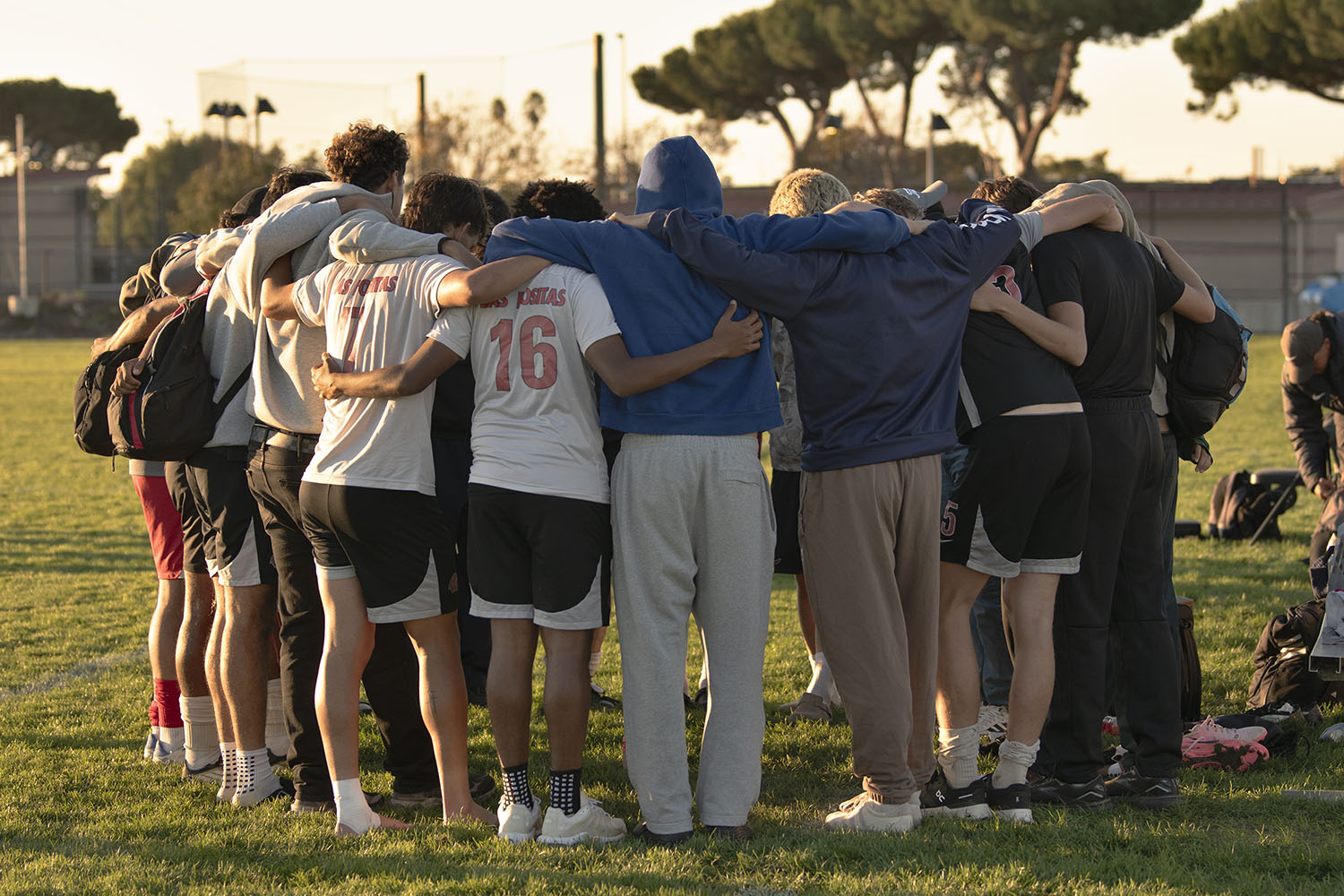 THE SUN SET on the Las Positas’ season as the team huddles in Salinas following their 2-0 loss Nov. 22 at Hartnell in the second round of the 3C2A NorCal Playoffs. The Hawks conclude the 2025 campaign with just one in over its final six games, including two shutouts at the hands of Hartnell, the No. 6-ranked team in the state. (Photo by Ian Kapsalis/The Express).
