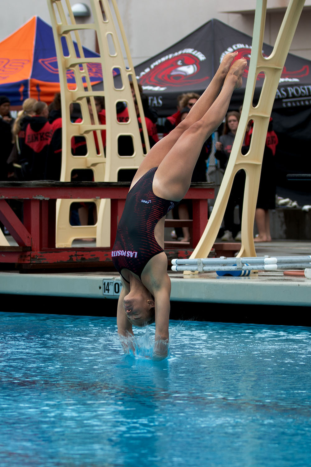 SPLASH DOWN Ainsley Wade breaches the water surface and gracefully braces for impact at the NorCal Regional Diving Qualifier on Apr. 11 at LPC. Wade placed 3rd on 1-meter and 3-meter dive events. (Photo by Eric Liang/ The Express)