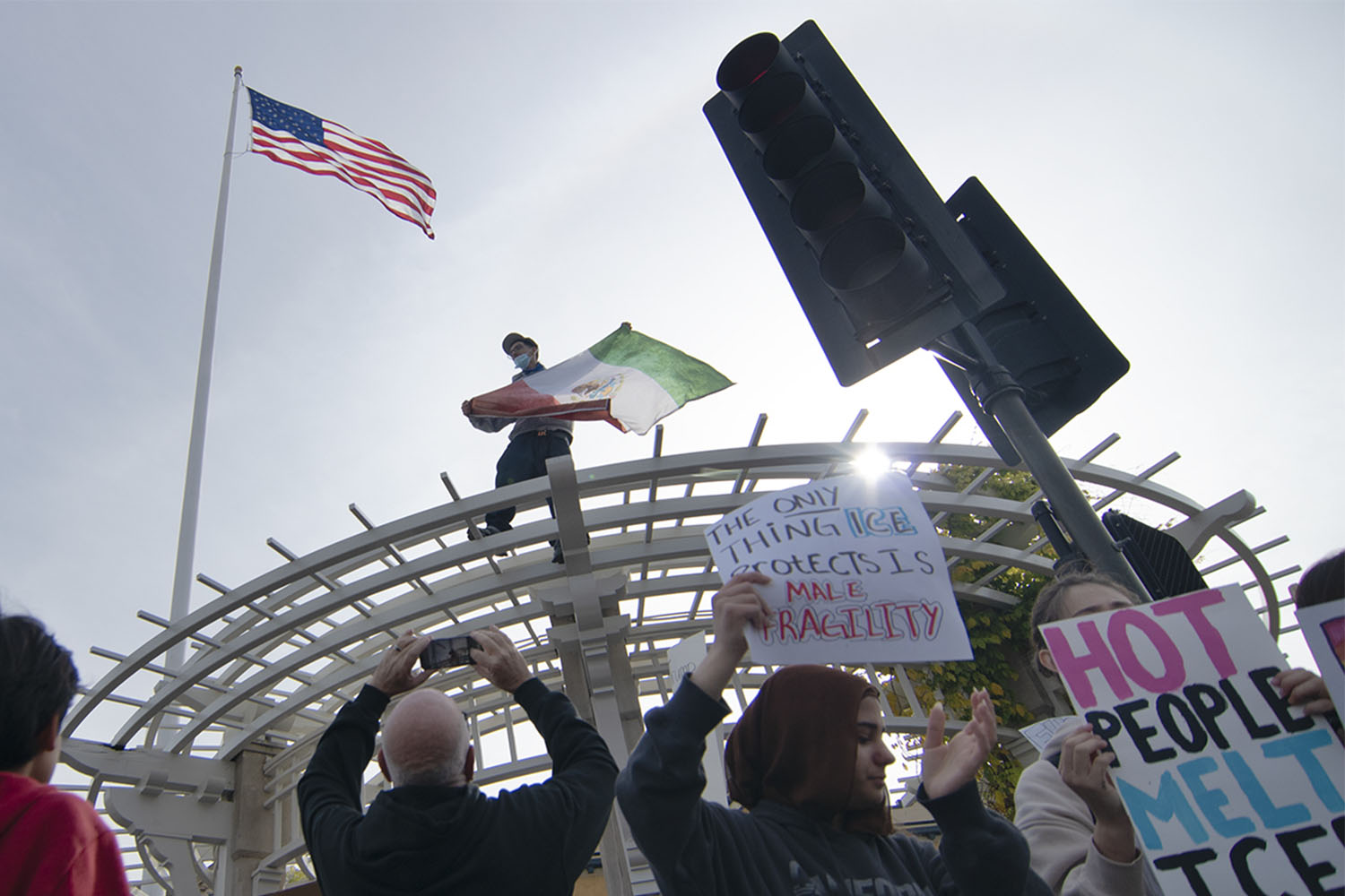 Climbing on top of the pergola a protestor waves a Mexican flag as the crowd roared with applause. Those gathered varied in background — but came together in one common goal — to protest I.C.E. (Photo by Ian Kapsalis/The Express)