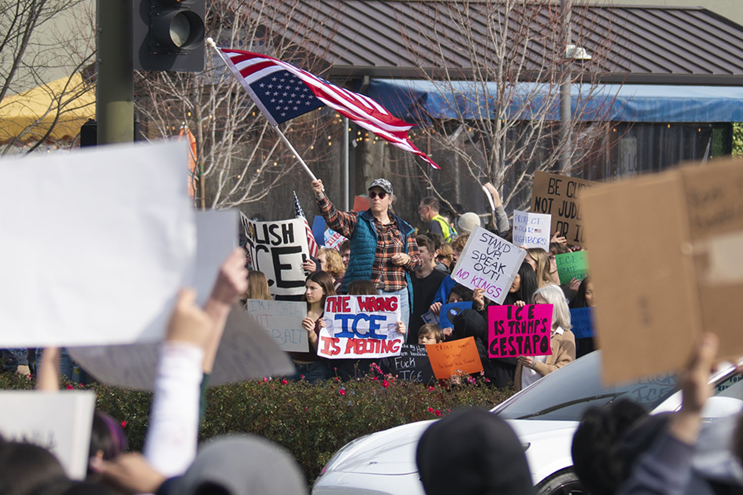 A boy stands tall upon the street light’s crosswalk signal — holding a sign reading “ICE OUT.” Turning to the crowd he hoists the sign in a call for applause. (Photo by Ian Kapsalis/The Express)